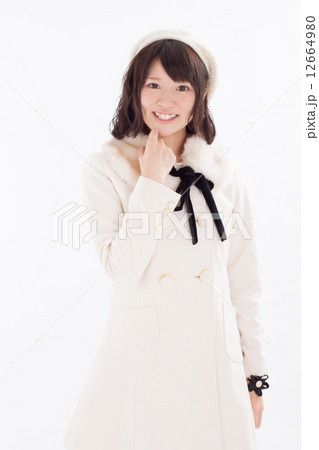 秋冬ファッションでブリッ娘ポーズをするキュートな女の子