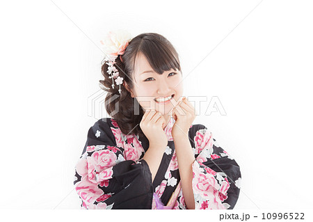 可愛らしい花柄の浴衣を着て楽しそうに笑うキュートな女の子