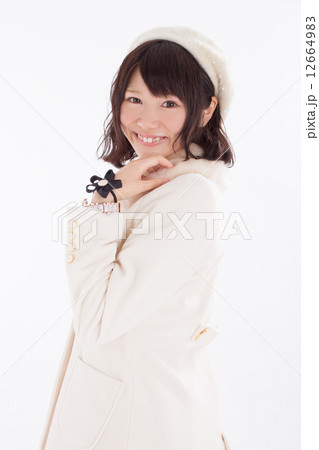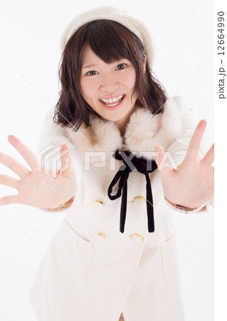 秋冬ファッションでブリッ娘ポーズをするキュートな女の子