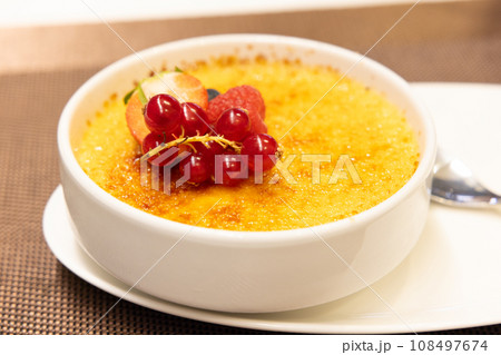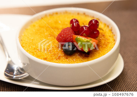 Creme brulee. Traditional French vanilla cream dessert with frui