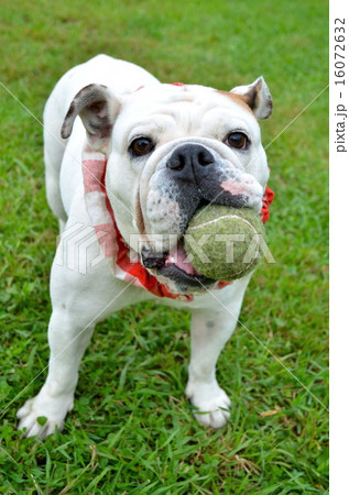 草原でボールをくわえるブルドッグ