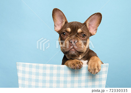 Portrait a cute french bulldog looking at the camera and hanging over a blue basket on a blue background with its paws over the edge of the basket