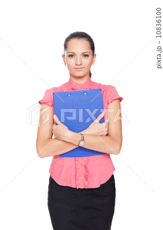beautiful young businesswoman hugging clipboard isolated on whit