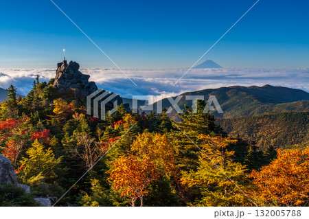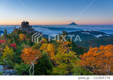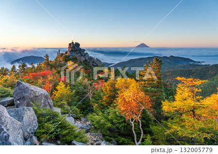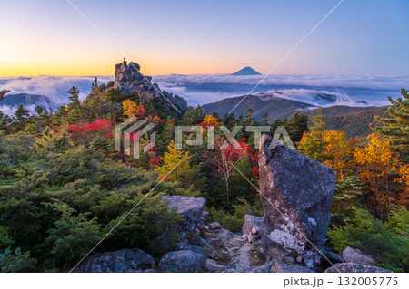秋の奥秩父山塊天狗峰から紅葉の天狗岩の朝日に輝く天空の剣と朝焼けの富士山
