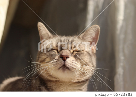眩しくて目を閉じる表情の猫のアメリカンショートヘアブルータビー