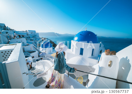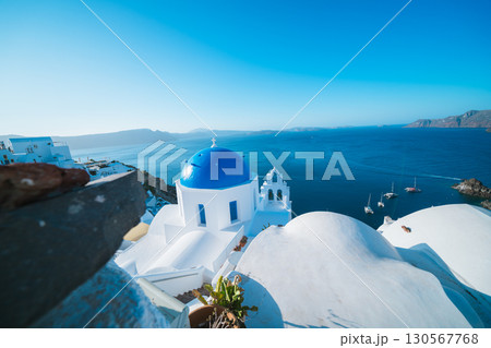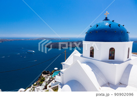 ギリシャ サントリーニ島のイメロヴィグリのブルードームの主の復活の教会と白い街並み