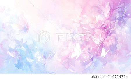 ドリーミーなパープルとブルーの蝶と花の水彩イラスト背景