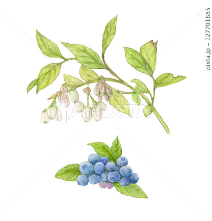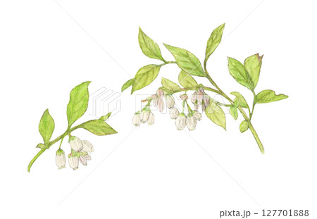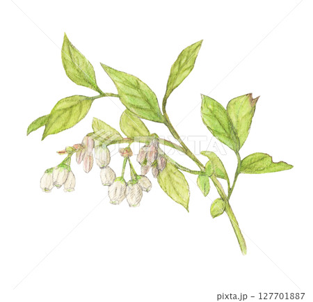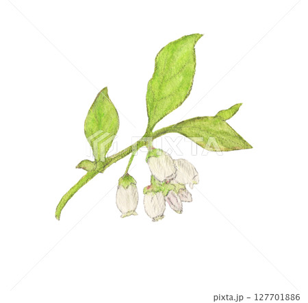 花のついたブルーベリーの枝 水彩色鉛筆イラスト