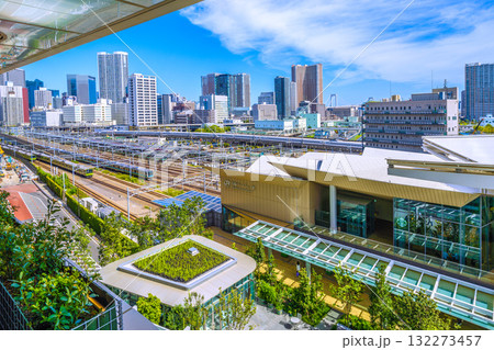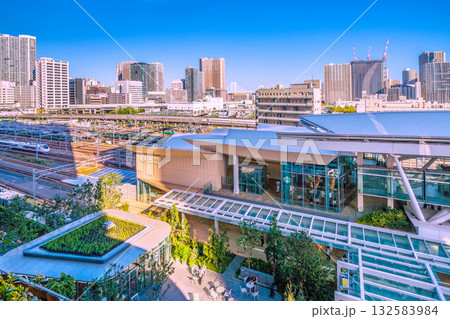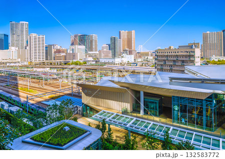 日本の東京都市景観新風景。高輪ゲートウェイ駅や新幹線、特急電車、芝浦のタワーマンション群などを望む