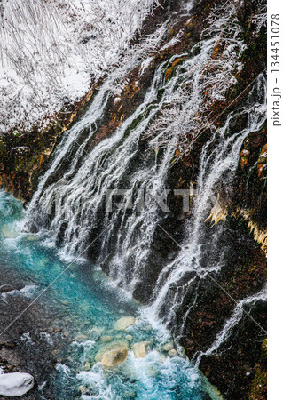 雪景色に輝く青の流れ 美瑛・白ひげの滝