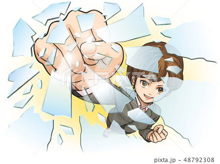 コンクリートの壁を壊して通り抜けるパンチ 壁を破るイメージイラスト