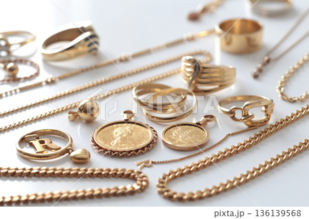 金を含む貴金属類のアクセサリーを並べた集合写真