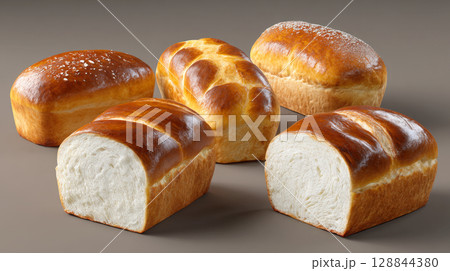An appetizing display of freshly baked white bread loaves, showcasing their golden-brown crusts and soft, airy interior. Ideal for sandwiches, toast, or a delicious side to any meal