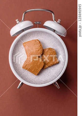 A breakfast of sandwiches with toast and peanut butter. Breakfast plate concept on a vintage alarm clock
