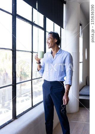 Businessman enjoying coffee break while looking out office window, feeling relaxed