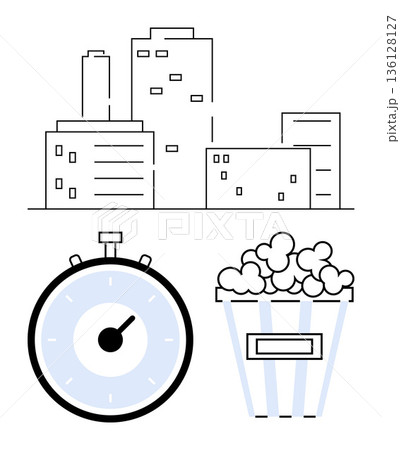Time management, entertainment, urban lifestyle, leisure, relaxation, productivity. Minimalistic cityscape, stopwatch and popcorn. Time management and entertainment combined in a visual