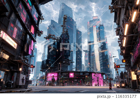 雷鳴轟く未来都市の雑多な建物や看板が並ぶ交差点風景