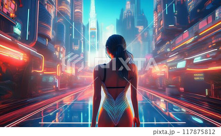 サイバーパンクな未来都市・東京を見下ろす女性戦士