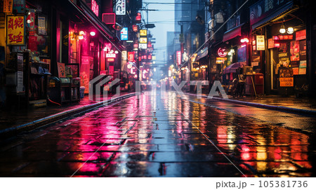 雑多に増築された建物が立ち並ぶ未来都市の雨降る交差点風景