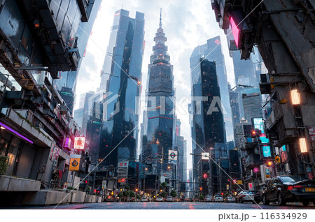 未来都市の雑多な建物が立ち並ぶ通りを車が走る様子を描いた風景