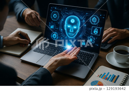 AI generated scene of multiple people working together using digital tools with a glowing AI head hologram at the center symbolizing smart collaboration