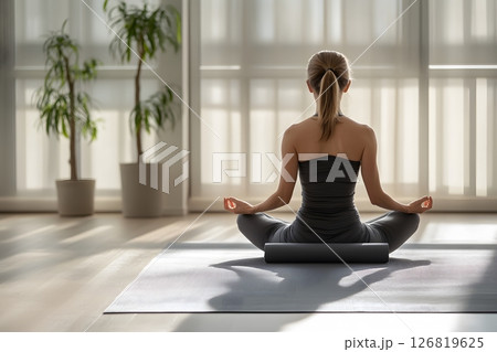 Young woman practicing meditation in living room, sitting on a yoga mat, calm and serene, peaceful home, healthy lifestyle,