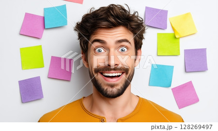 Smiling man surrounded by colorful sticky notes on a wall.