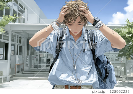 熱中症で頭を抱える男子高校生のイラスト素材(夏・学校前)