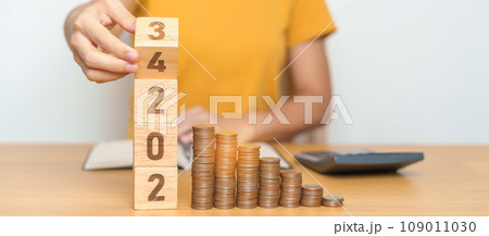 flipping 2023 to 2024 year block with Coins stack. Money, Budget, tax, investment, financial, savings and New Year Resolution concepts