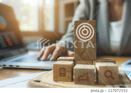 Concept of business growth, woman hand stacking wood blocks with target icon, office desk, High resolution