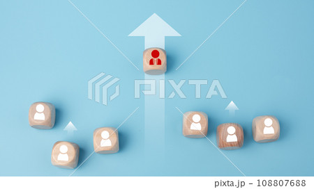 Leadership, business success, unique ideas, individuality, challenge, and motivation. Manager wooden block leads with rising arrow and followed by wooden block on blue background.