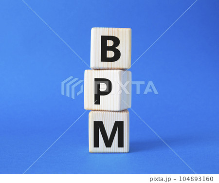 BPM - Business Process Management symbol. Wooden cubes with words BPM. Beautiful blue background. Business and BPM concept. Copy space.