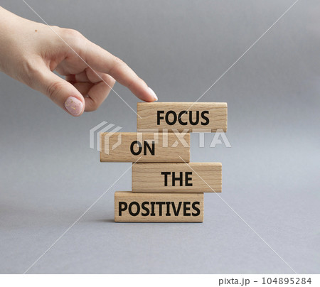 Focus on the Positives symbol. Concept word Focus on the Positives on wooden blocks. Beautiful grey background. Businessman hand. Business and Focus on the Positives concept. Copy space