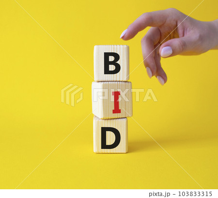 BID symbol. Concept word BID on wooden blocks. Beautiful yellow background. Businessman hand. Business and BID concept. Copy space