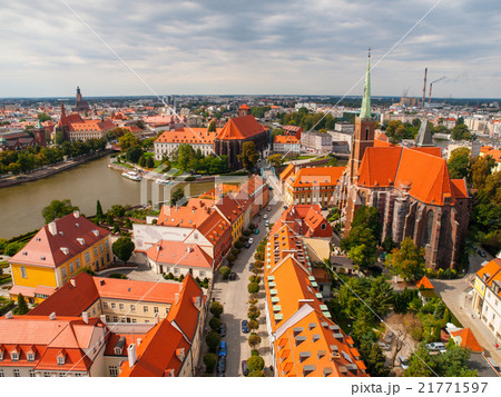 The aerial view of Wroclaw: Ostrow Tumski, Cathedral of St. John the Baptist and Collegiate Church