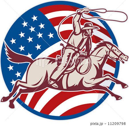 cowboy riding horse with lasso and american flag