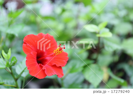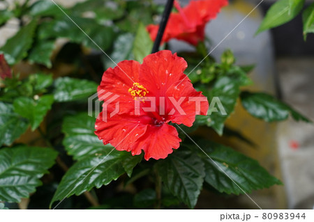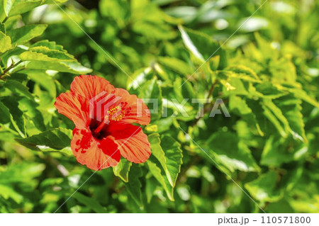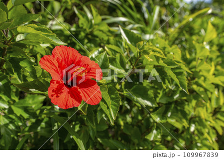 道端に咲く赤いハイビスカス 沖縄県名護市