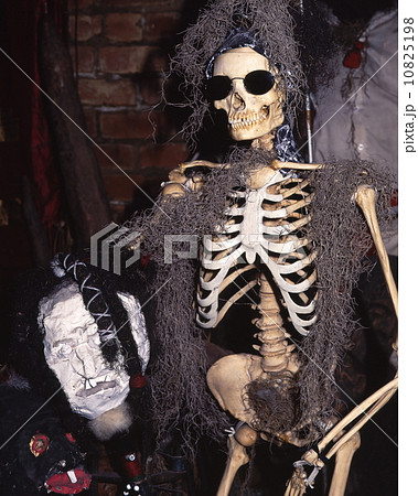 halloween. magic skeleton with pumpkin. woman in makeup and co
