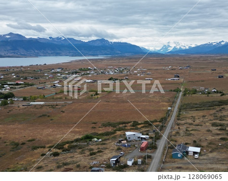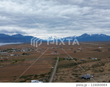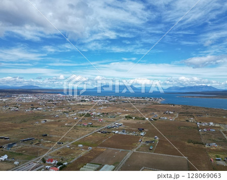 アンデス山脈を望むプエルトナタレスの町の空撮