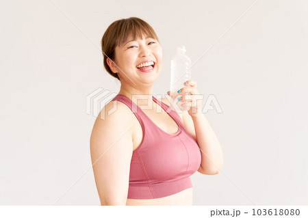 ペットボトルの水を手に持つ笑顔のぽっちゃり女性 プラスサイズモデル エクササイズ