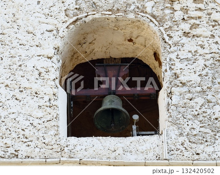 historic bronze bell in rustic niche, aged bronze bell within weathered architectural niche setting