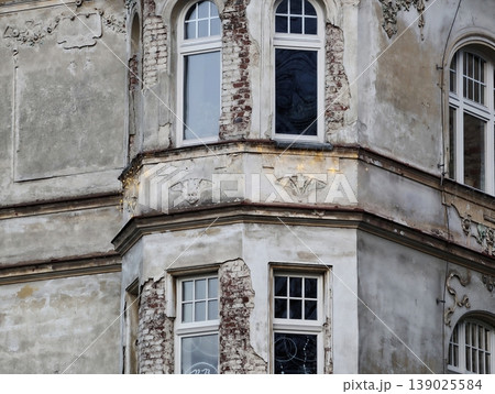 Facade Of Ornate Building Showcasing Fractured Stucco And Aged Decorative Features For Assessment