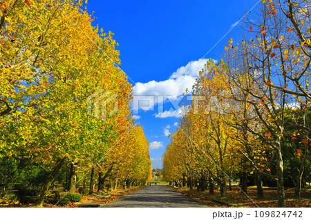 【大阪府】快晴の万博記念公園の西大路のプラタナス並木の黄葉
