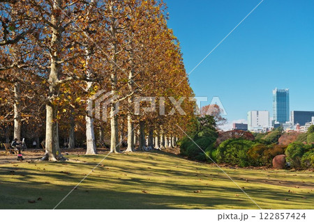 秋晴れの都内公園 プラタナス並木と高層ビルのコラボ
