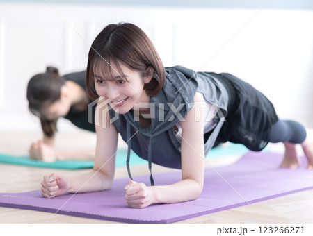 パーソナルジムで体を鍛える笑顔の若い女性 筋トレ女子 腕立て伏せ プランク ストレッチ ヨガ