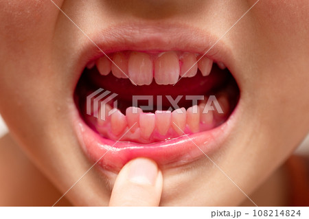 Gum bleeding and inflammation close up. A man examined by a dentist. The diagnosis of gingivitis