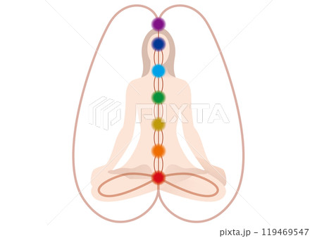 ヨガ・瞑想をしている女性とチャクラのイラスト チャクラの場所