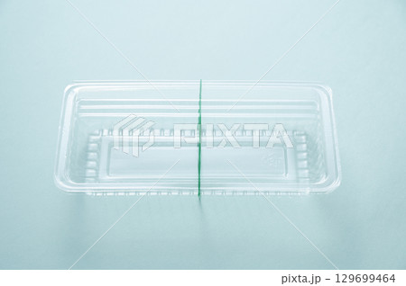 黄色い紙の上に置いたプラスチックのスーパー弁当の蓋を開いた空き容器