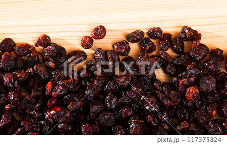 Dehydrated blueberries on wood surface. Natural food background