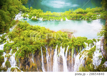 クロアチア プリトヴィツェ湖群国立公園のエメラルドグリーンの湖と流れ落ちる滝